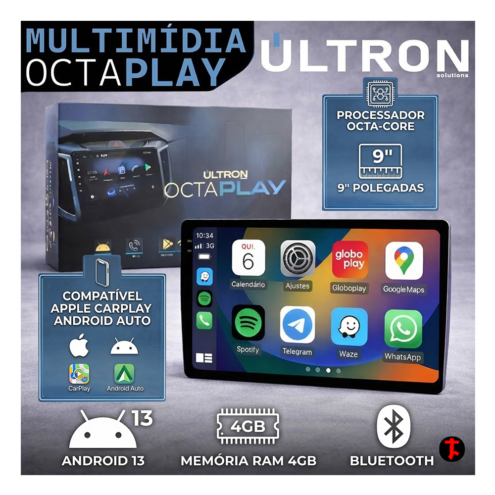Com o processador Octa Core Unisoc 8581 ARM Cortex-A55 de 1,60 GHz, memória RAM de 4GB e armazenamento interno de 64GB, o Octa Play garante um desempenho rápido e fluído para todas as suas funções. Equipado com o moderno Android 13, você terá acesso à Play Store, aplicativos atualizados e total compatibilidade com CarPlay e Android Auto wireless. Mais tecnologia, mais praticidade ao alcance dos seus dedos.